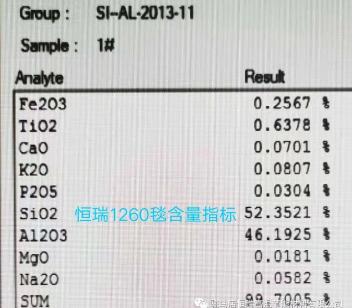5,恒瑞1260型纤维毯的成分分析单,三氧化二铝含量高达46%(国内大部分厂家的1260毯含量最高为44%左右),氧化铁含量极低。